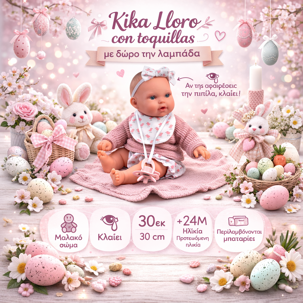 Η Kika Lloro con toquilla είναι μια εντυπωσιακά ρεαλιστική κούκλα που φέρνει την εμπειρία ενός αληθινού μωρού στο παιχνίδι. Με τρυφερή έκφραση και προσεγμένες λεπτομέρειες, δημιουργεί μια μοναδική συναισθηματική σύνδεση από την πρώτη στιγμή.