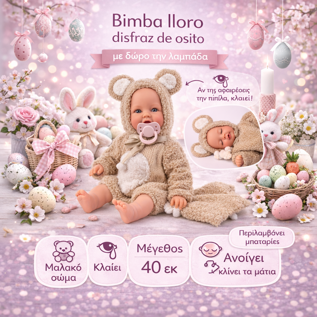 Η Bimba lloro disfraz de osito είναι η πιο γλυκιά και τρυφερή κούκλα που θα κλέψει την καρδιά κάθε παιδιού από την πρώτη στιγμή. Ντυμένη με την πιο χαριτωμένη στολή αρκουδάκι, συνδυάζει μοναδικό design με ρεαλιστικά χαρακτηριστικά, δημιουργώντας μια εμπειρία παιχνιδιού που μοιάζει με αληθινή φροντίδα μωρού.